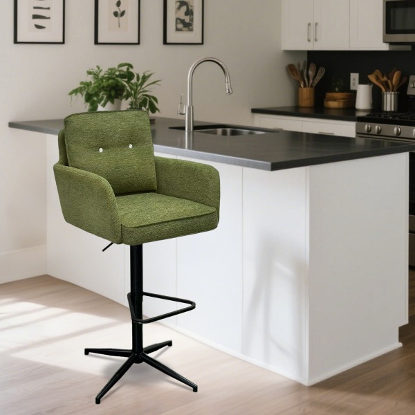 Modern yeşil kumaş ayarlanabilir döner çubuk tabure otomatik geri dönüş ve metal taban ile