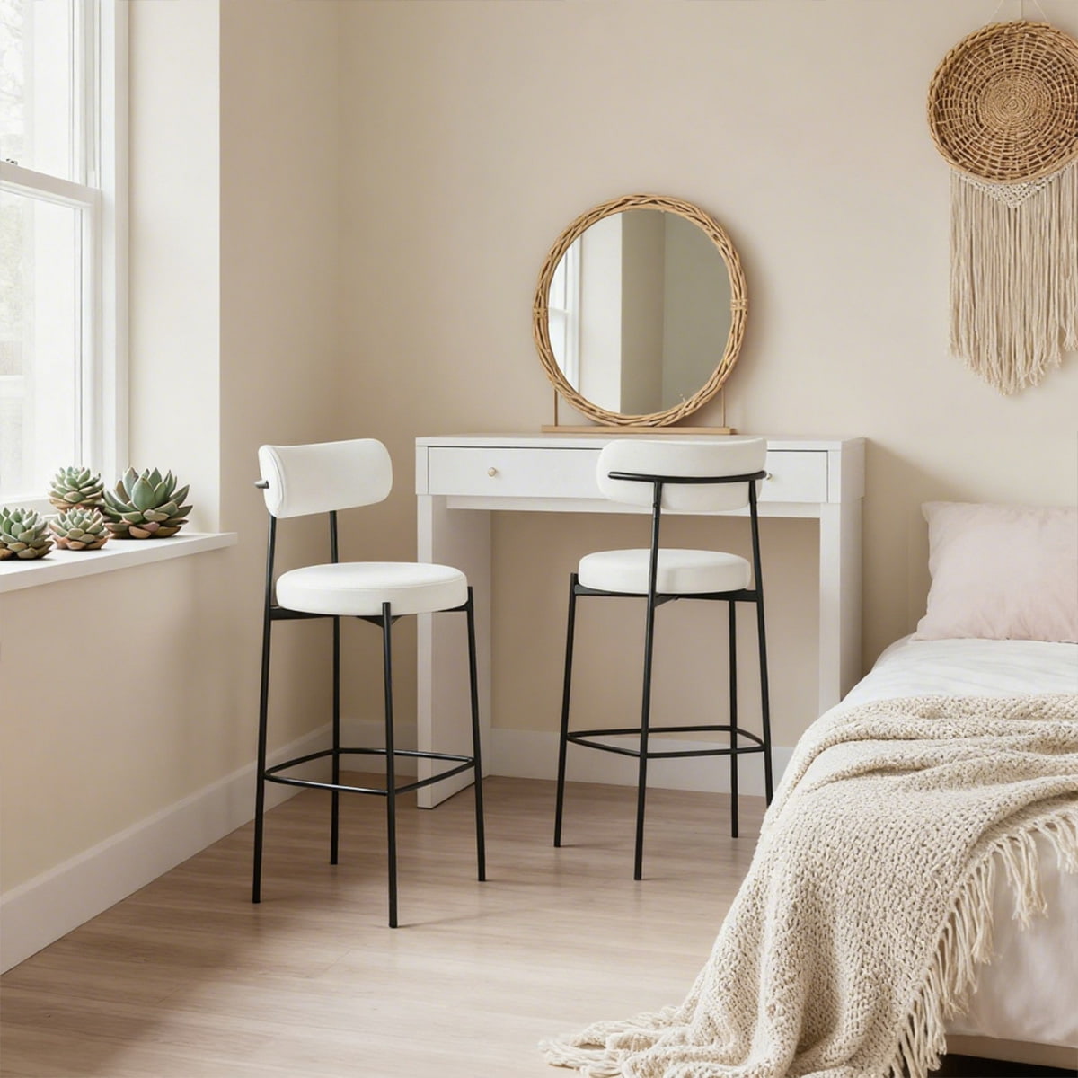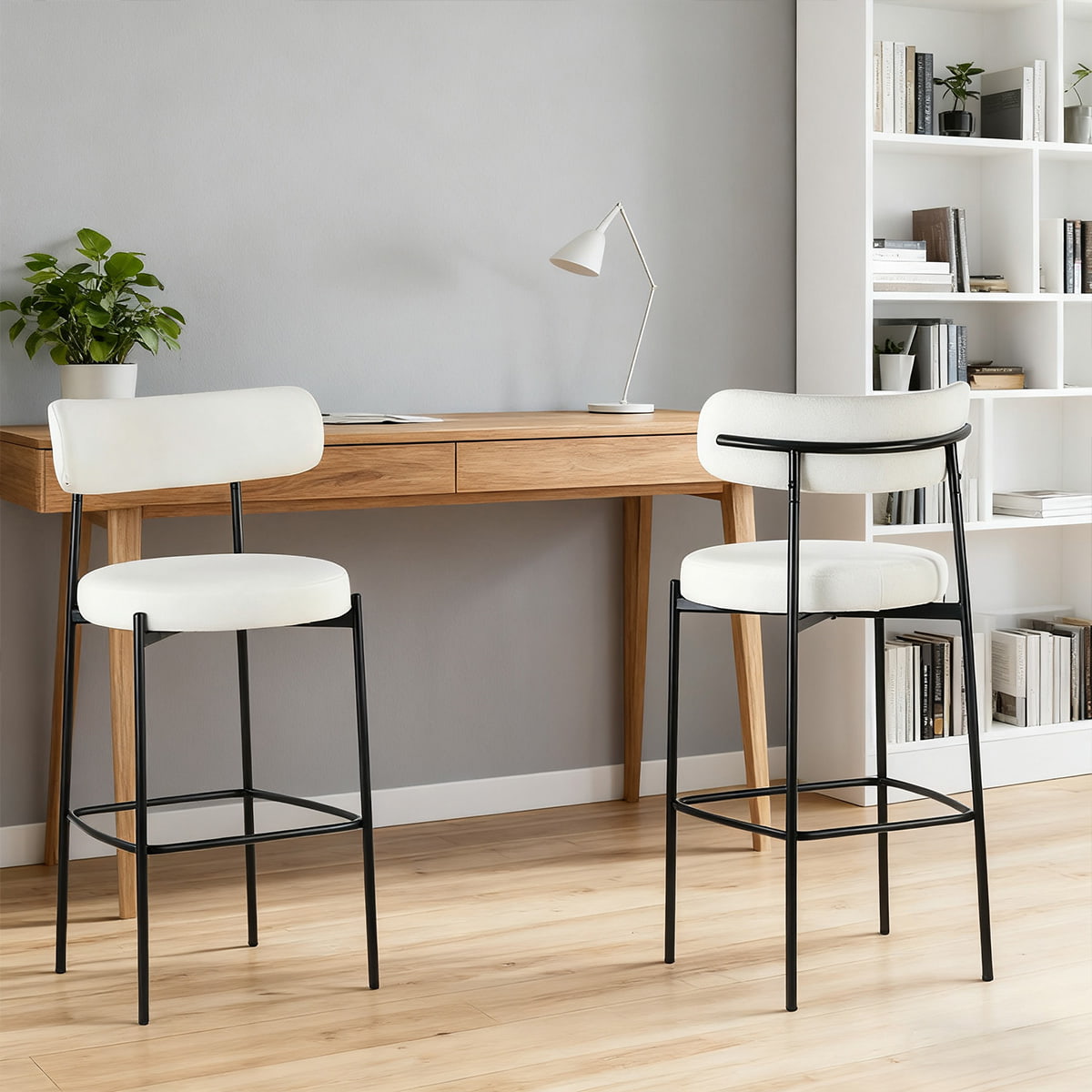 Beyaz bukleli tezgah taburelerimiz, dayanıklı siyah metal çerçeveler, yüksek yoğunluklu köpük koltuklar ve ergonomik sırtlıklarla konfor ve stil için tasarlanmıştır; mutfak tezgahları, barlar, restoranlar ve oteller için idealdir.