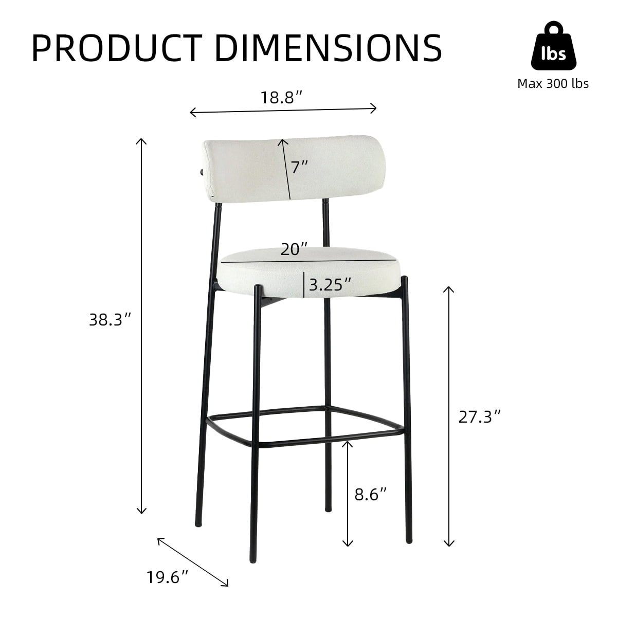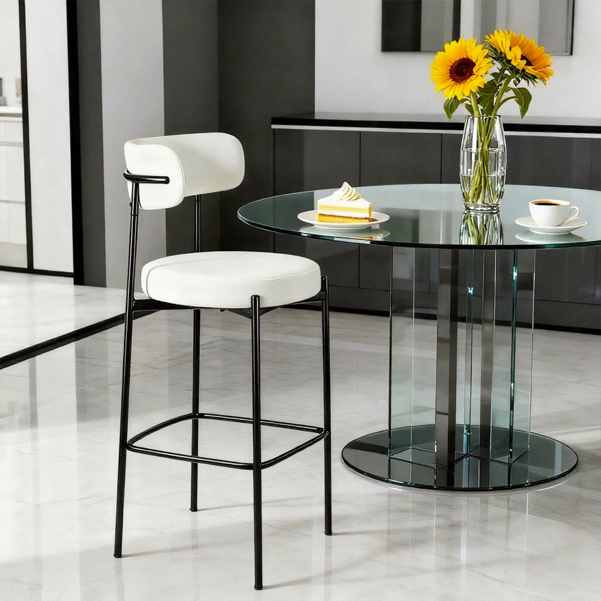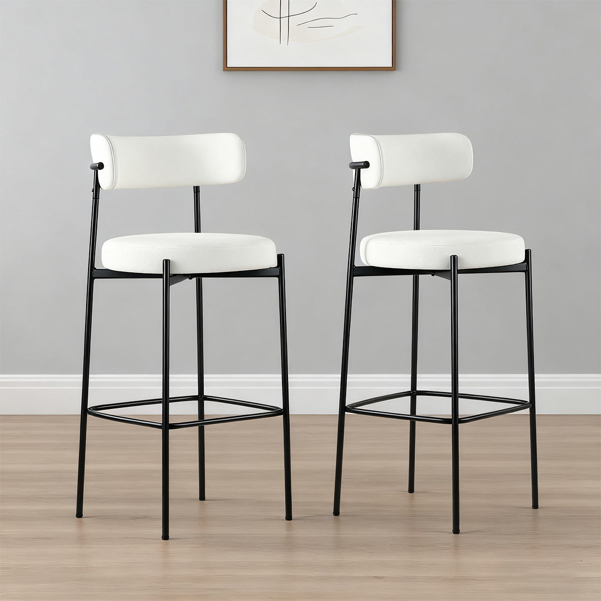 Siyah Metal Ayaklı Modern Beyaz Buklet Bar Taburesi - Mutfak Adası, Yemek Odası ve Ev Barı için Arkalık ve Ayak Dayama Yerine Sahip Döşemeli Tezgah Yüksekliği Bar Sandalyeleri