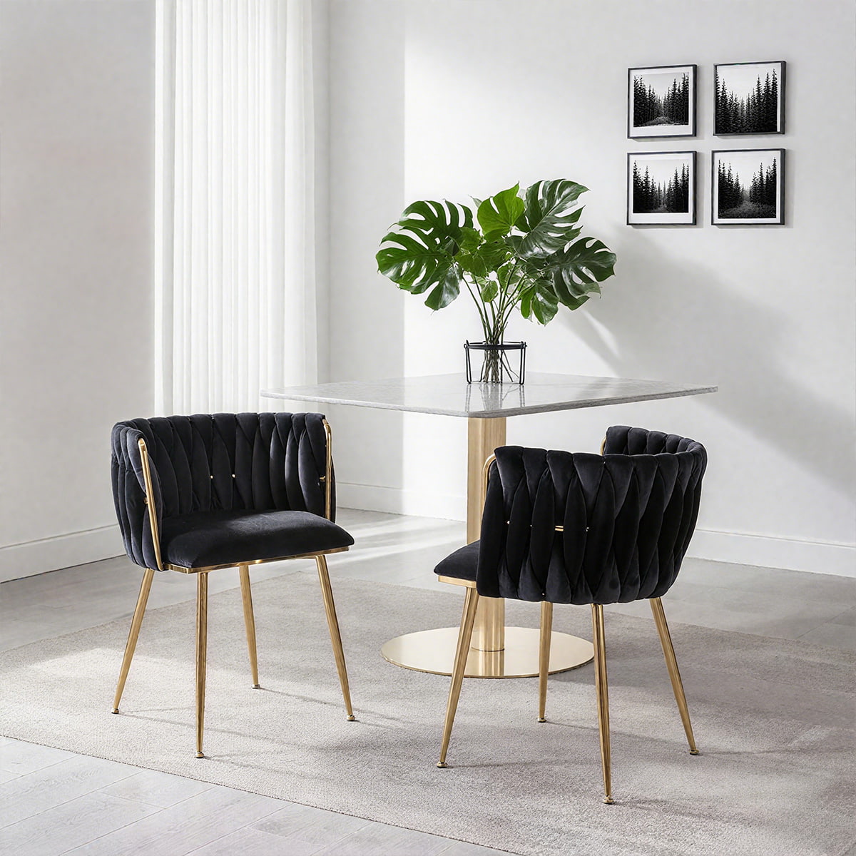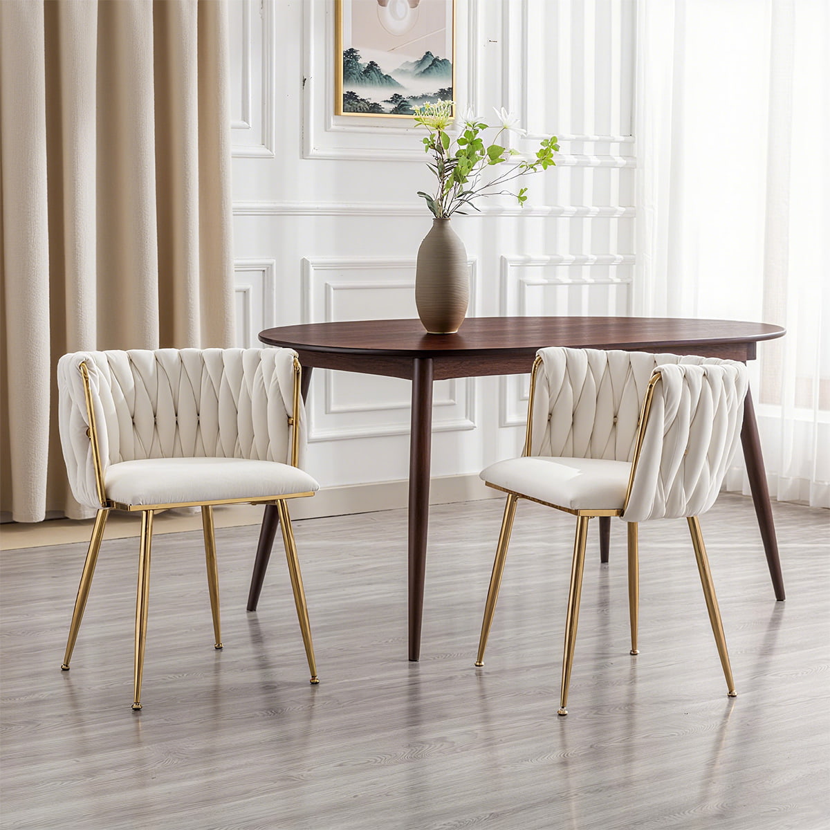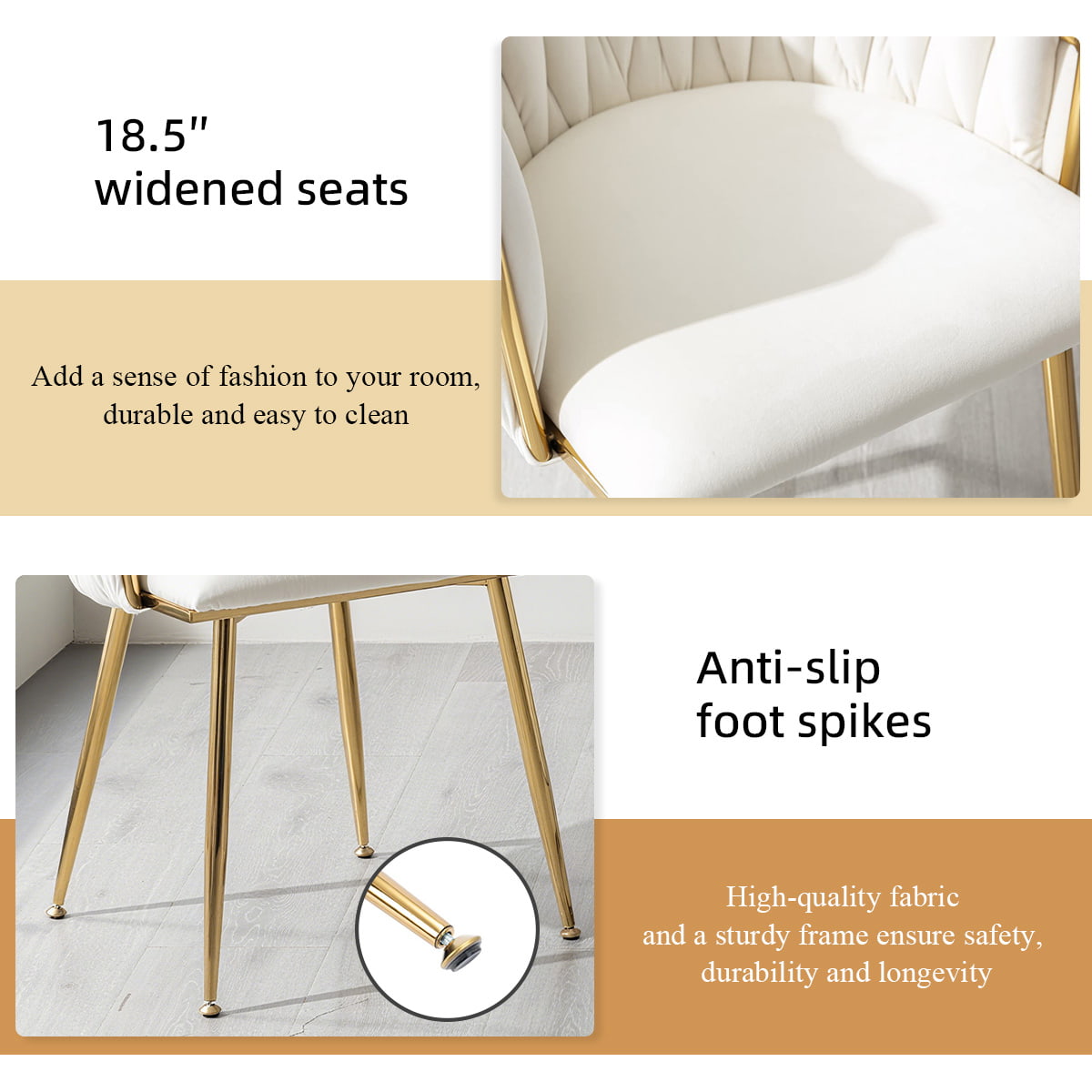 Dokuma sırt dayanağına sahip bu fildişi kadife döşemeli yemek sandalyesi, çok yönlü, modern bir vurgulu sandalye, makyaj taburesi ve yüzyıl ortası yan sandalyedir. Lüks kadife kumaşı, altın rengi metal ayakları, ergonomik sırt desteği ve yüksek yoğunluklu köpük yastıklarıyla hem konfor hem de şıklık için tasarlandı. Yemek odaları, oturma odaları, yatak odaları, makyaj odaları, ofisler, kafeler ve oteller için ideal olup hem ev kullanıcılarının hem de ticari alıcıların ihtiyaçlarını karşılar.