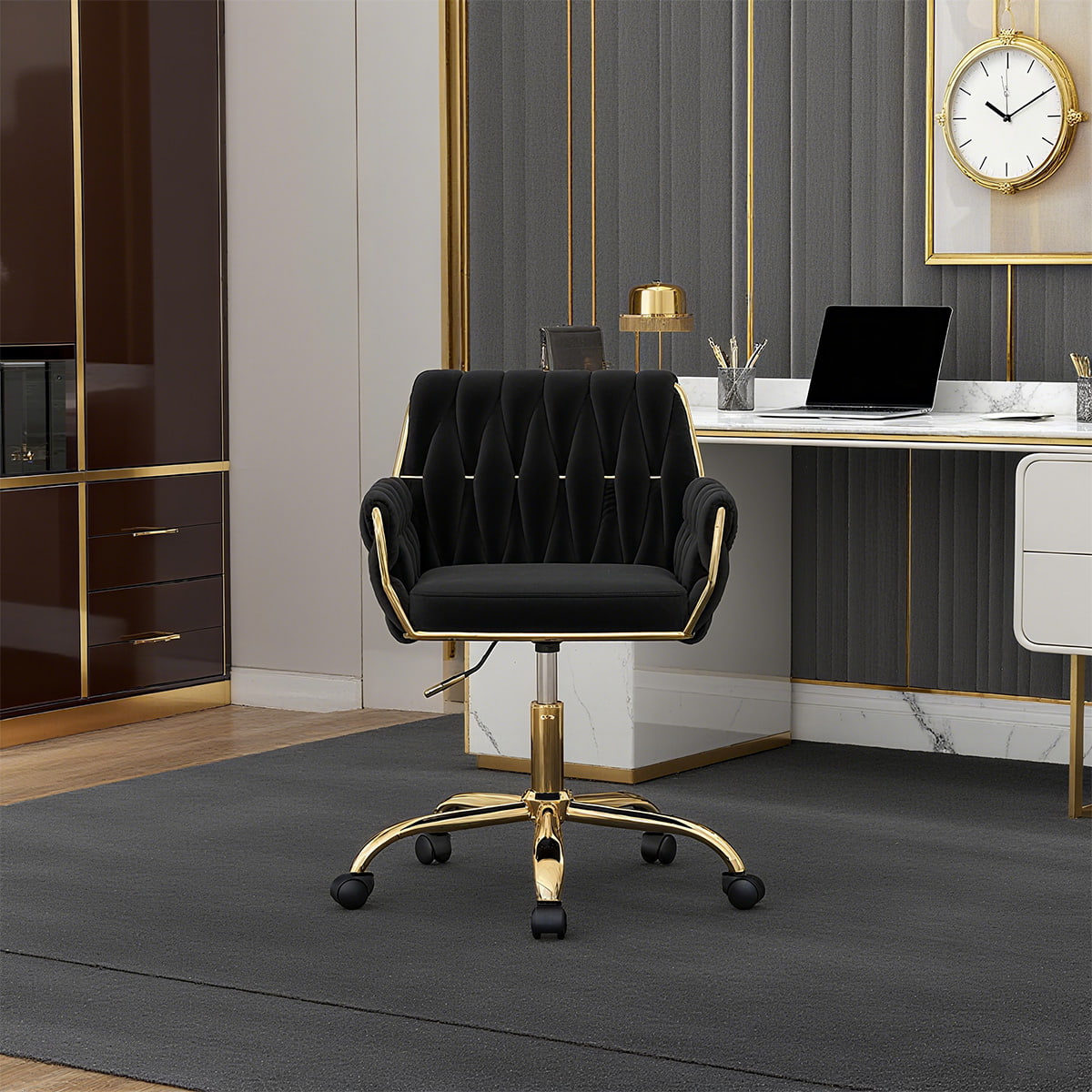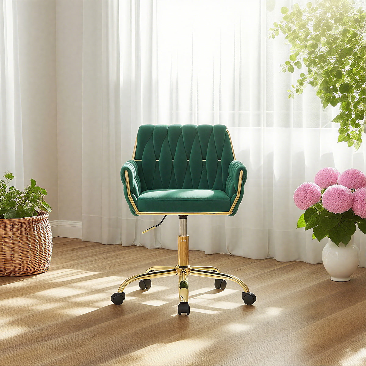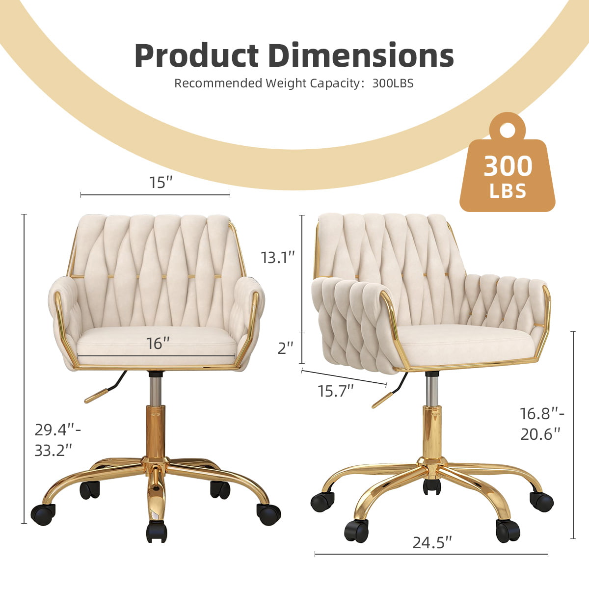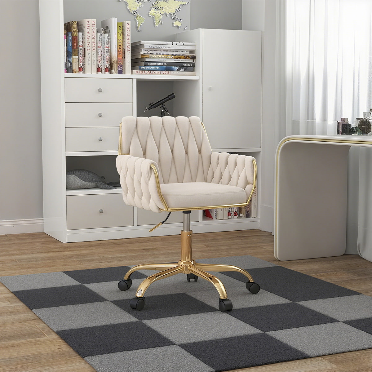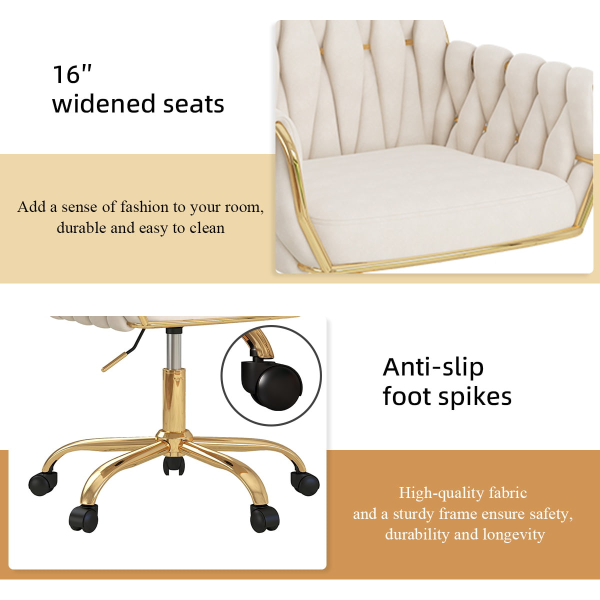 Bej Kadife Ev Ofis Koltuğu - Altın Tabanlı, El Dokuma Arkalık ve Kol Dayama, 360 ° Dönebilen Tekerlekli Masa Sandalyesi ile Modern Ayarlanabilir Makyaj Koltuğu