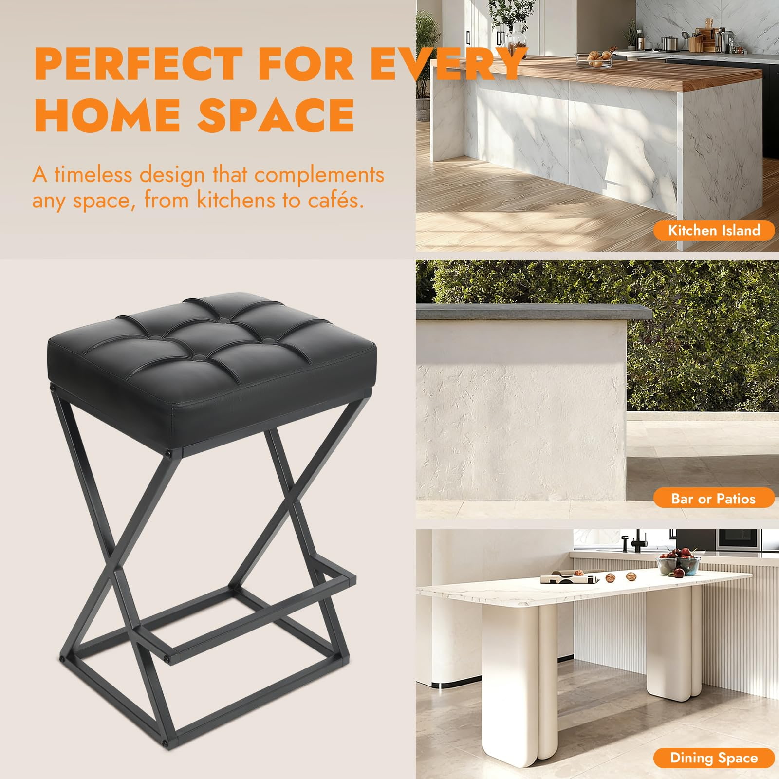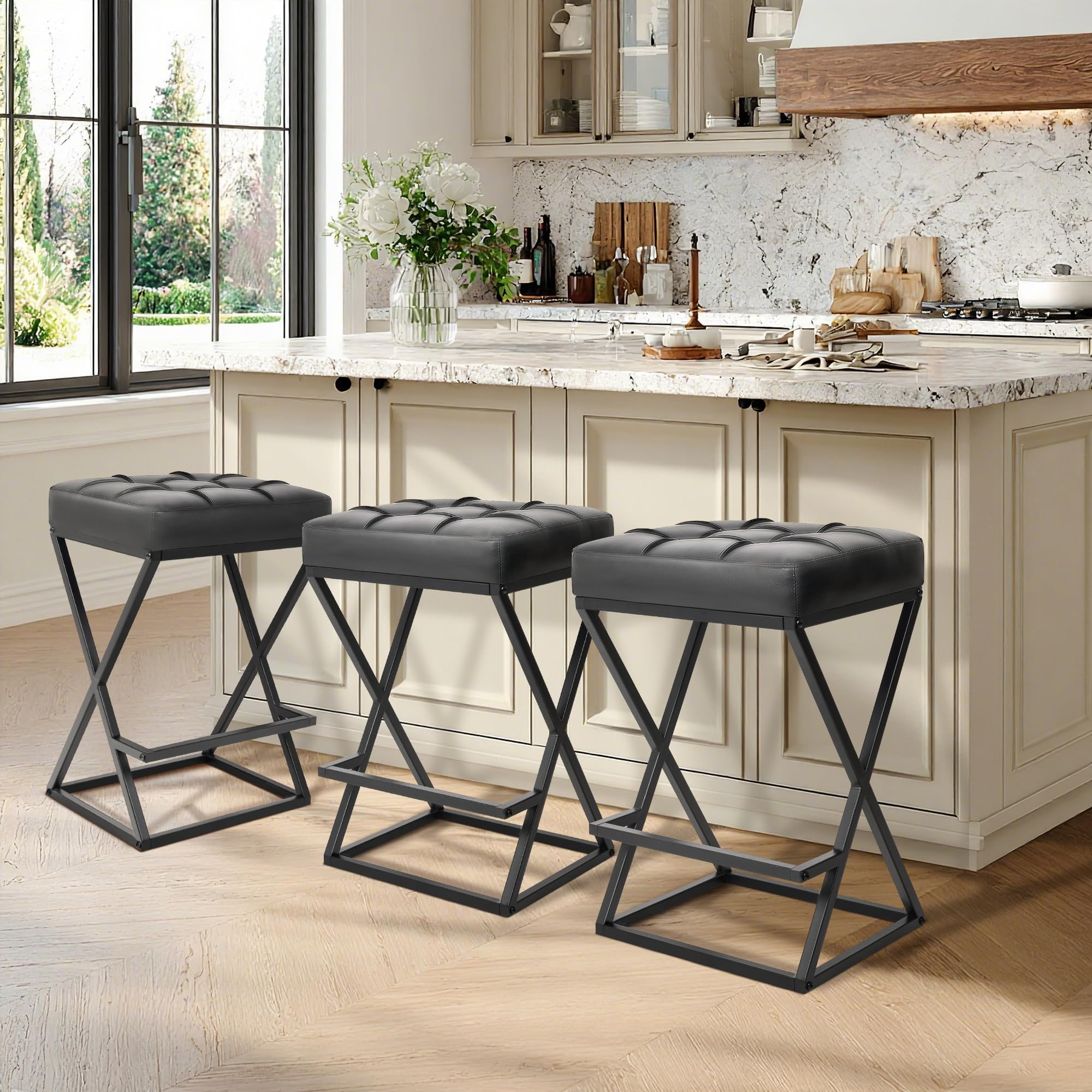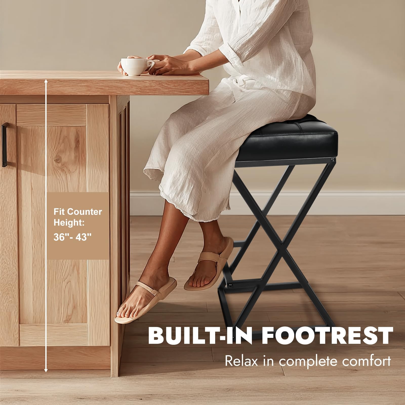 Döşemeli Deri Koltuklu Tezgah Yüksekliği Arkalıksız Bar Tabureleri, Mutfak Adaları Siyah için Ayak Dayama Yeri ile X-Çerçeve Metal Dengesi
