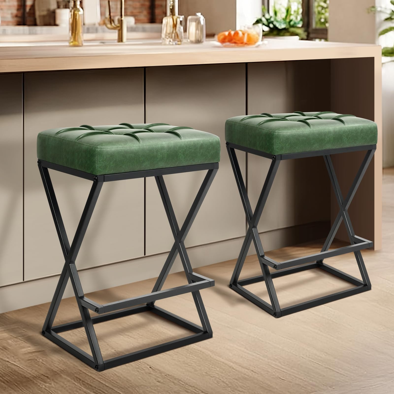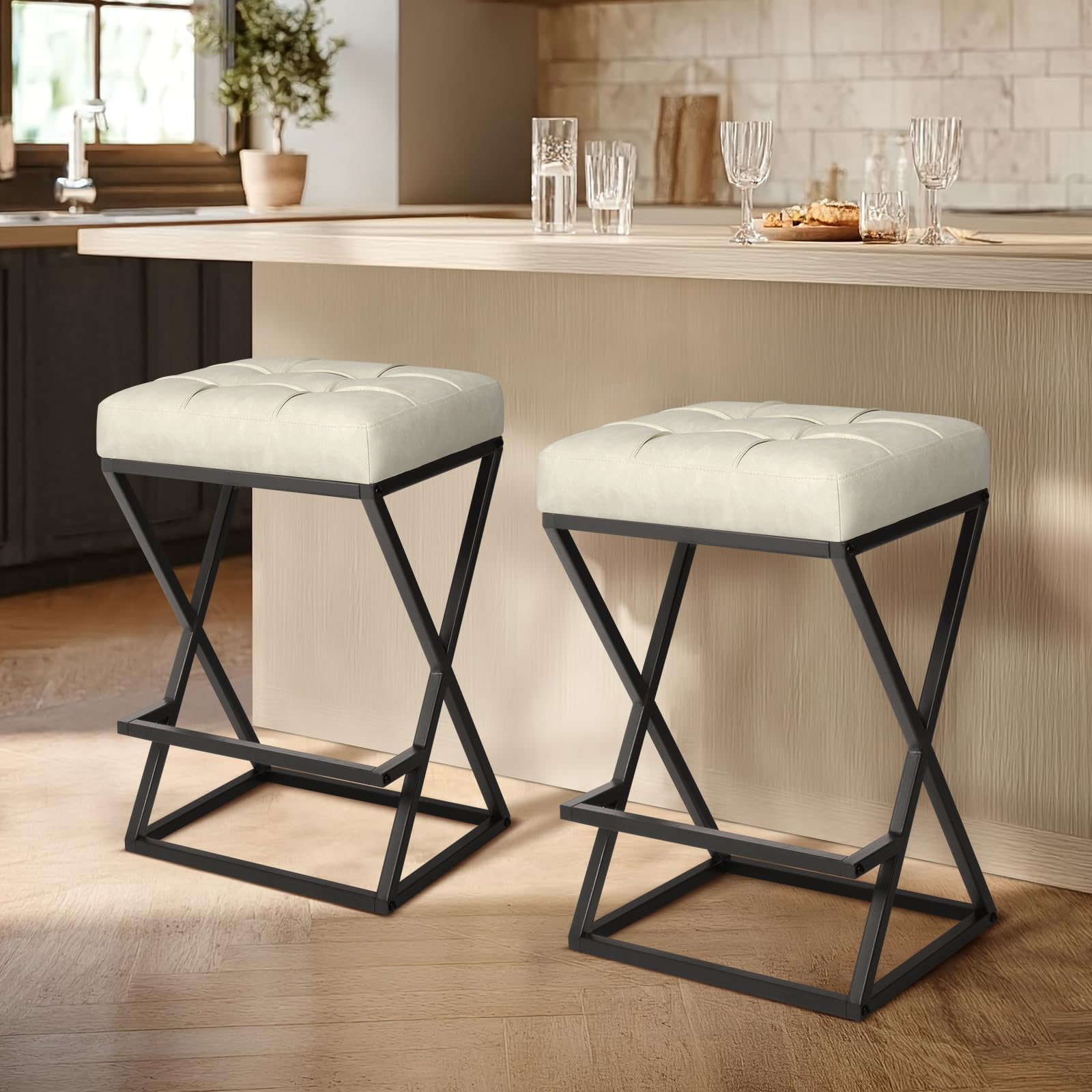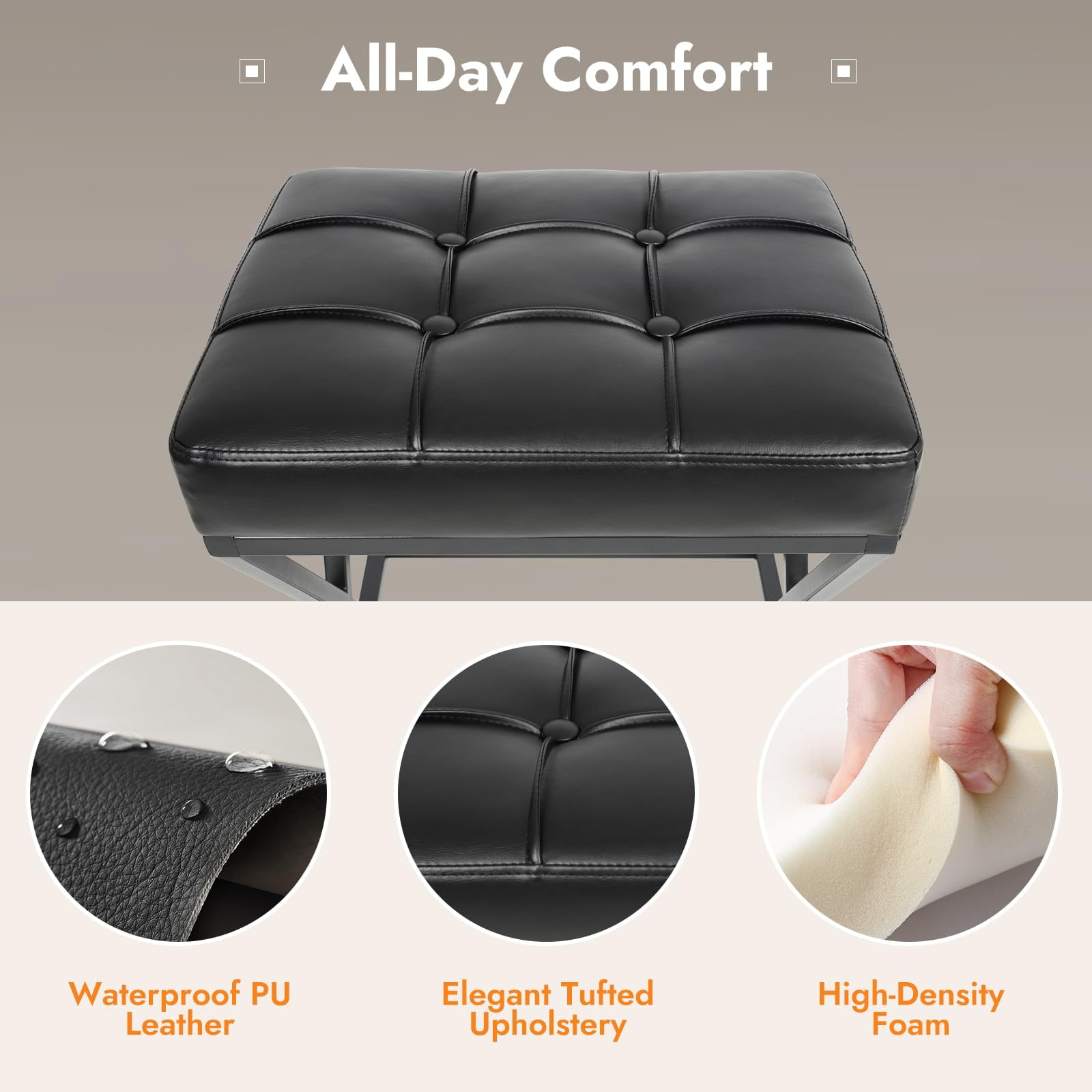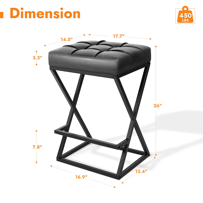 Döşemeli Deri Koltuklu Tezgah Yüksekliği Arkalıksız Bar Tabureleri, Mutfak Adaları Siyah için Ayak Dayama Yeri ile X-Çerçeve Metal Dengesi