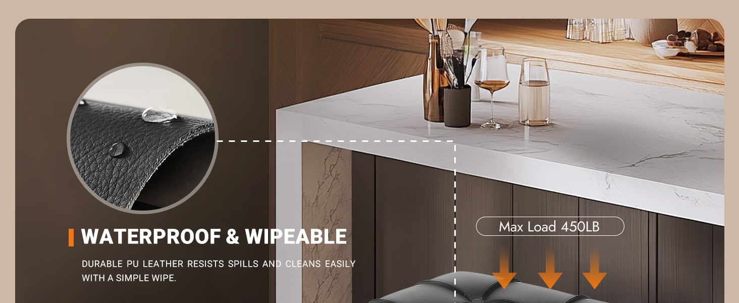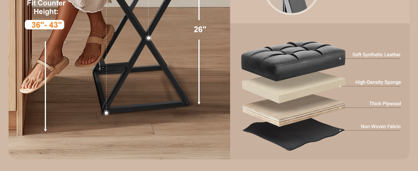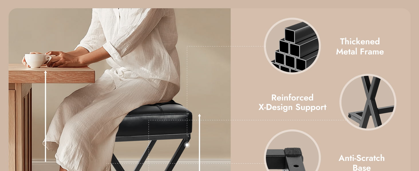 Hem konut hem de hafif ticari ortamlar için tasarlanan bu tezgah yüksekliğinde arkalıksız bar taburesi, güçlendirilmiş X çerçeveli metal yapıya, yüksek yoğunluklu köpük dolgulu suni deri koltuğa ve mutfaklar, apartmanlar, kafeler ve konaklama projeleri için ideal olan kompakt bir ayak izine sahiptir. 26 inçlik koltuk yüksekliği standart mutfak adalarına ve tezgahlarına uyarken, arkalıksız tasarım taburenin tamamen altına kaydırılarak kullanılabilir alanı en üst düzeye çıkarmasına olanak tanır.