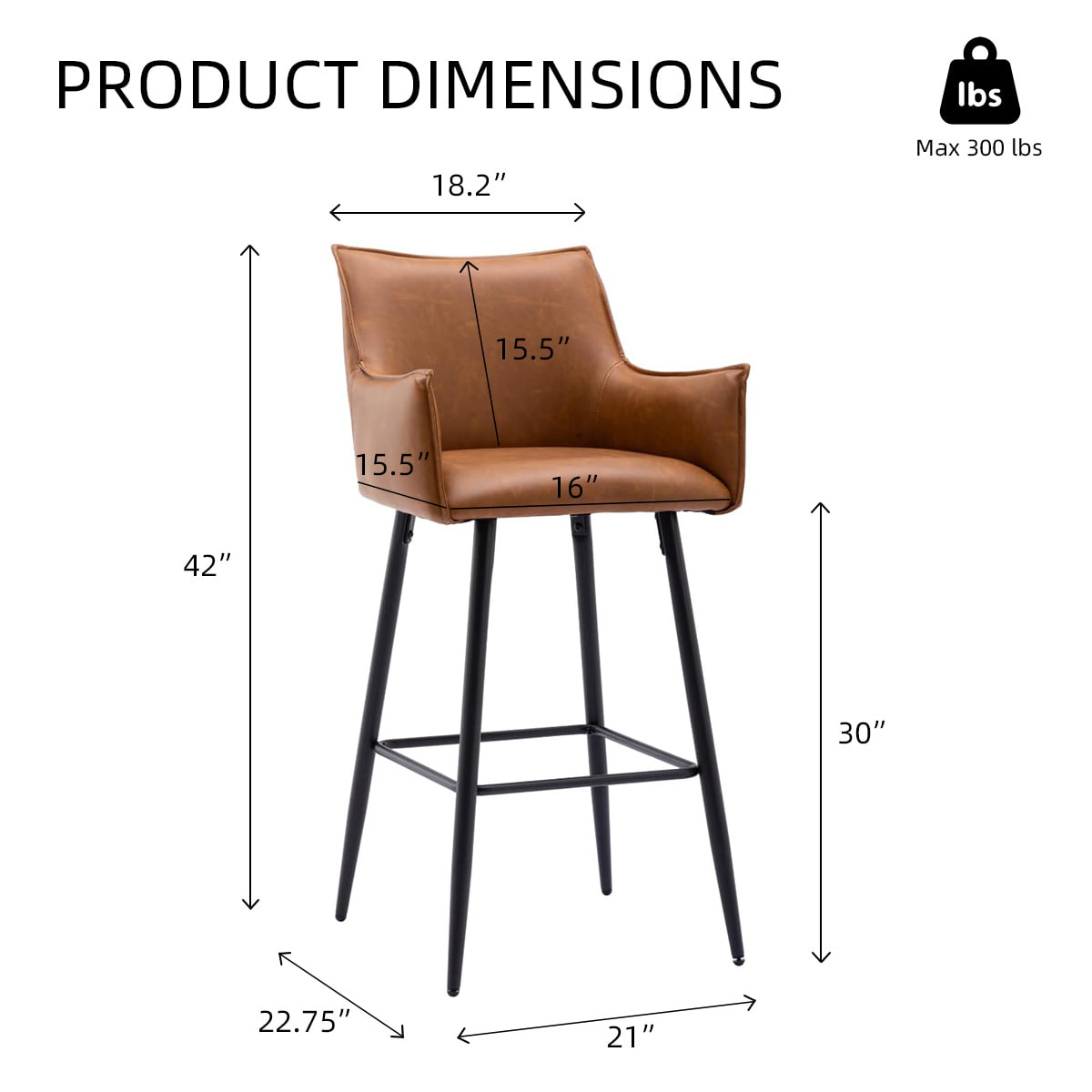 Kolçaklı ve Arkalıklı Modern Kahverengi PU Deri Bar Taburesi - Mutfak Adası, Bistro veya Ev Barı için Siyah Metal Ayaklı Tezgah Yüksekliği Döşemeli Bar Sandalyesi